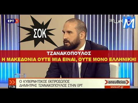Σοκ προκαλούν οι δηλώσεις του Κυβερνητικού Εκπροσώπου Δημήτρη Τζανακόπουλου στην ΕΡΤ (5-2-2018), όπου ανάμεσα σε άλλα προσπάθησε να ποδοπατήσει κυριολεκτικά το σύνθημα ψυχής του Ελληνισμού, που φωνάζει ρυθμικά 27 ασταμάτητα χρόνια "η Μακεδονία είναι μία και ελληνική", θέλοντας να καταδείξει σε όλους τους λαούς και ηγέτες του κόσμου, την ελληνικότητα και τα δίκαια της Μακεδονίας!
